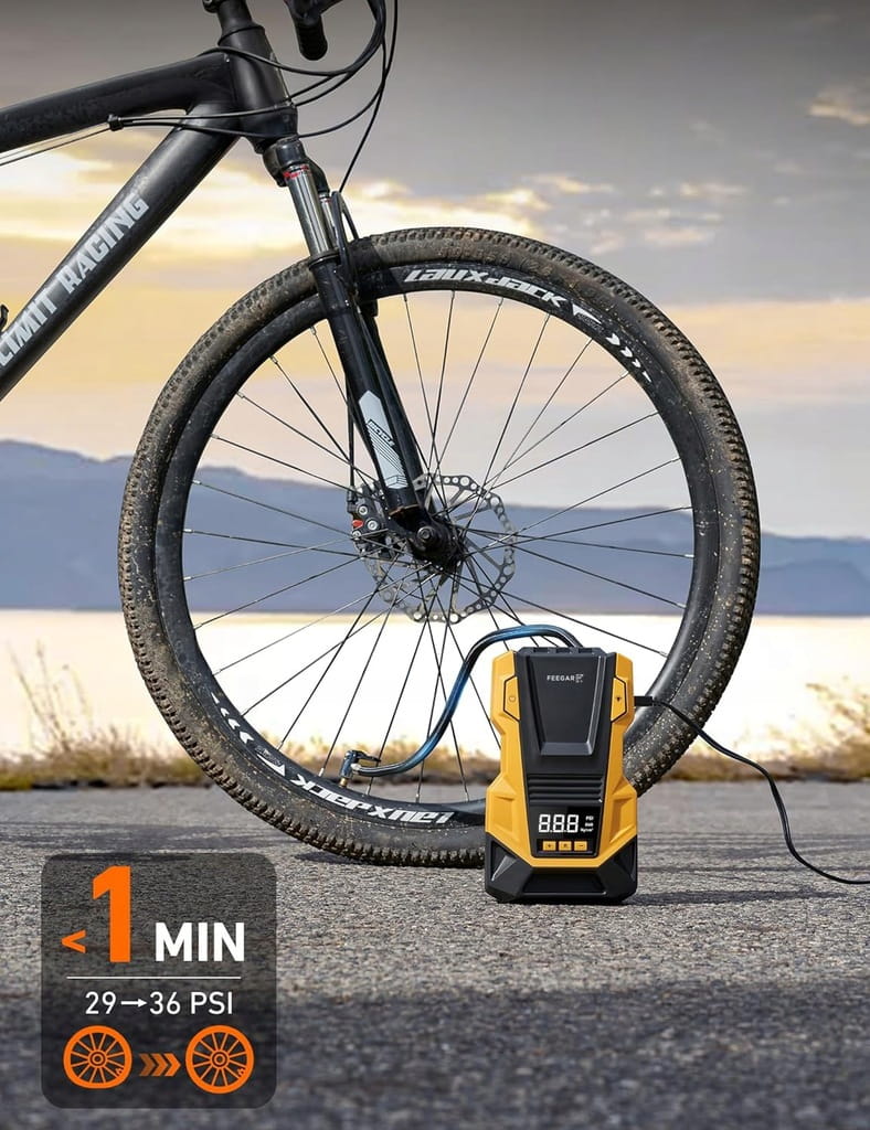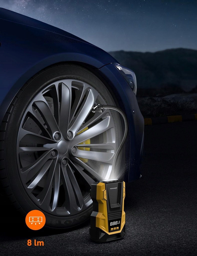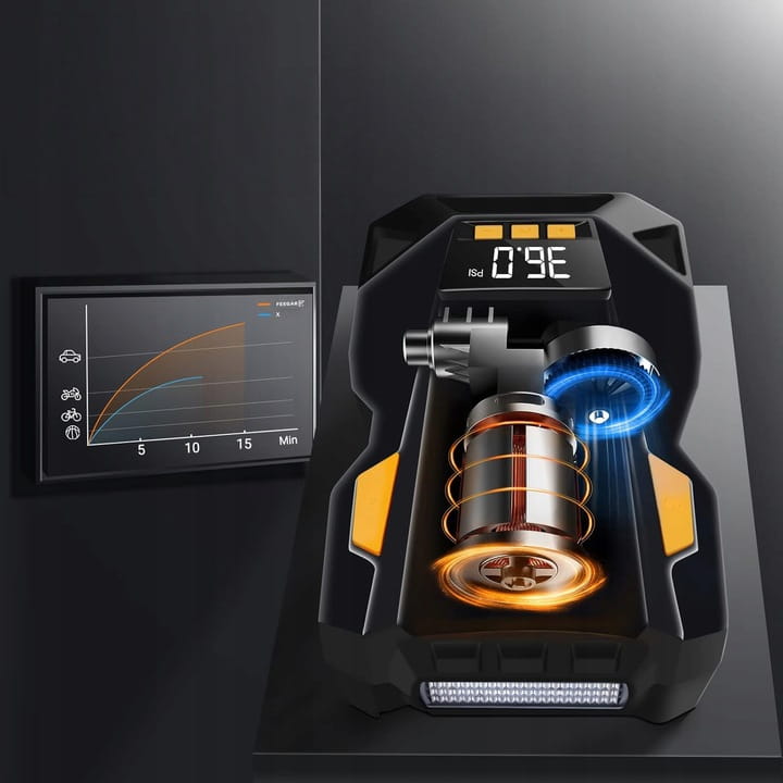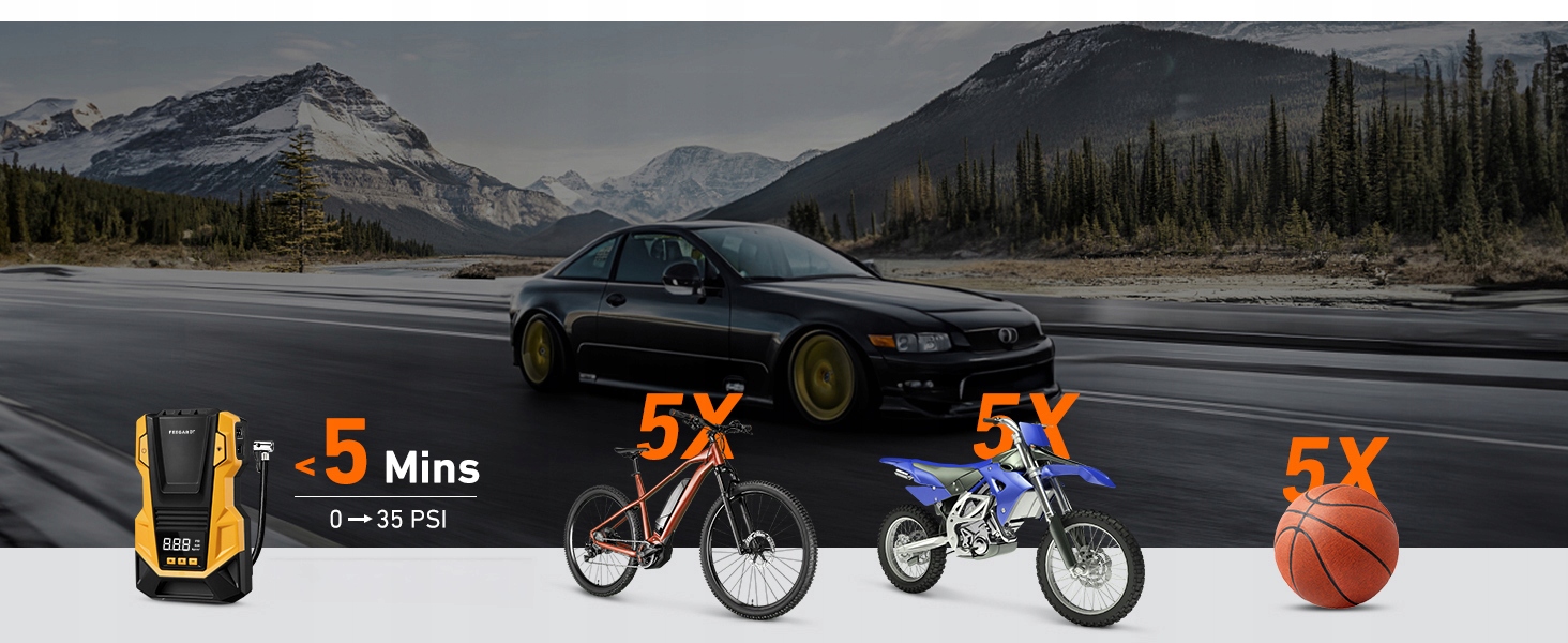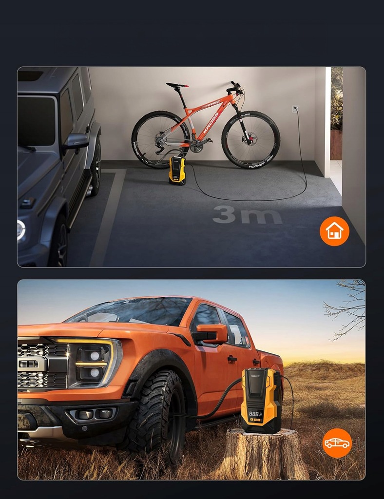 Pompa może szybko napompować opony przy maksymalnym ciśnieniu 150 PSI i przepływie powietrza 36 l/min. W ciągu zaledwie 1 minuty pompka może napompować oponę od 25 do 36 PSI, a w ciągu 5 minut całkowicie napompować oponę samochodową od 0 do 36 PSI. Idealnie nadaje się do pompowania samochodów, motocykli, hulajnóg, rowerów, piłek i innych dmuchańców.