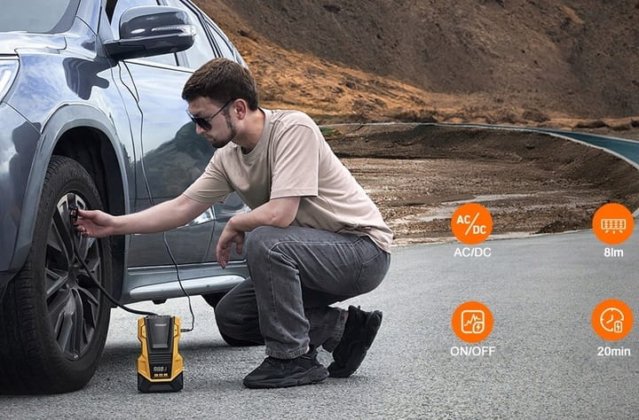 Pompa powietrza ma konstrukcję z podwójnym zasilaniem, która umożliwia przełączanie między trybem sieciowym 230V a trybem zasilania z auta 12V. Zastosowana konstrukcja podwójnego zasilania AC/DC naszego przenośnego kompresora powietrza może pobierać energię zarówno z gniazdka samochodowego, jak i ściennego w garażu. Dzięki temu nigdy nie musisz się martwić, że zabraknie Ci energii w podróży.