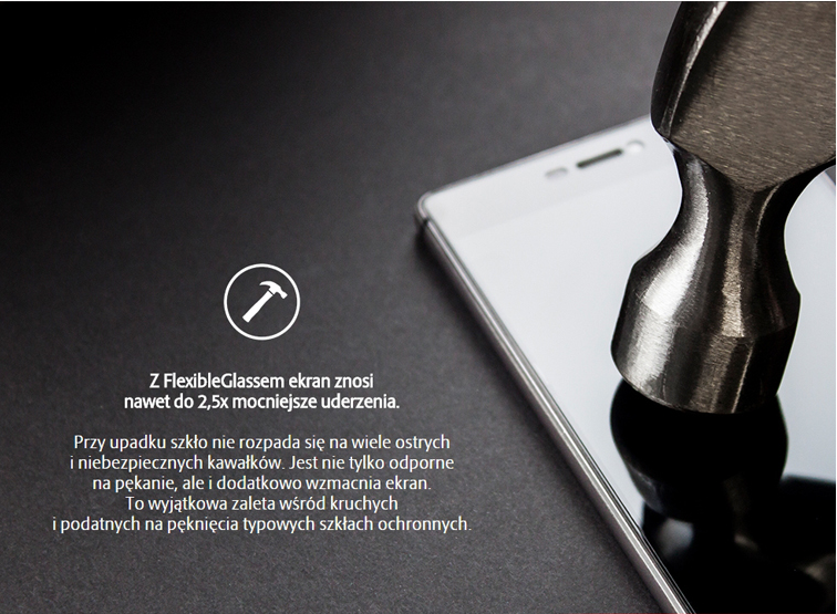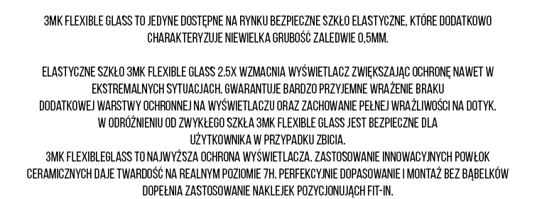 3mk Flexible Glass - to jedyne dostępne na rynku bezpieczne szkło elastyczne, które dodatkowo charakteryzuje niewielka grubość zaledwie 0,2mm. Elastyczne szkło 3mk FlexibleGlass 2,5x wzmacnia wyświetlacz zwiększając ochronę nawet w ekstremalnych sytuacjach.