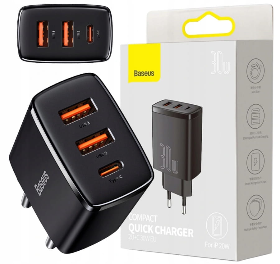 BASEUS Compact to urządzenie wyposażone w porty USB-C oraz 2x USB, kompatybilne z technologią Quick Charge 3.0 oraz Power Delivery 3.0, dzięki któremu możemy szybko naładować najnowsze urządzenia marki Apple, ale również niektóre laptopy wspierające ładowanie z portu USB-C. Zaawansowany system zarządzania energią zapewnia optymalny prąd ładowania. Ładowarka posiada system ochrony zapewniający stabilną i bezpieczną pracę, eliminując ryzyko uszkodzenia ładowanego urządzenia. Niewielki rozmiar produktu umożliwia jego użycie w praktycznie każdych warunkach, nawet podczas podróży. Dzięki mocy 30W ładowarka pozwala na szybkie ładowanie aż 3 urządzeń jednocześnie.