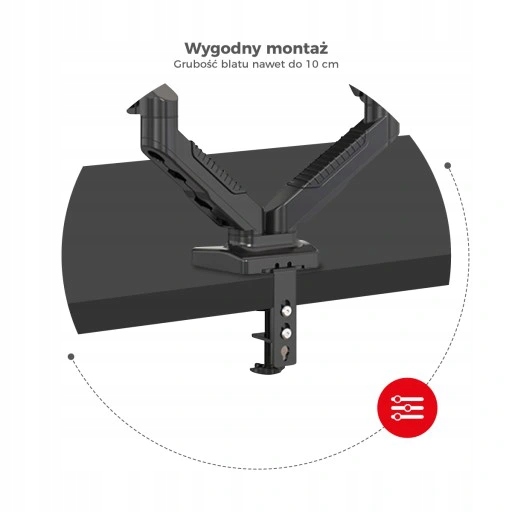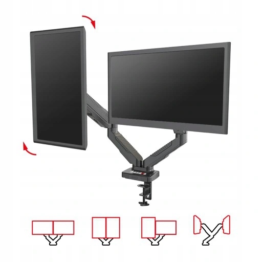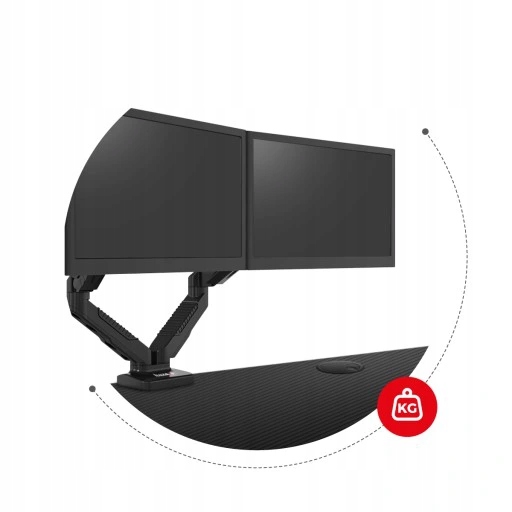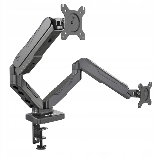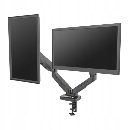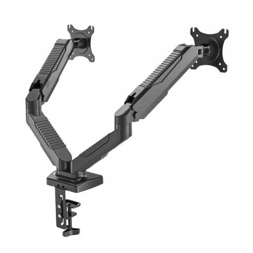- Metalowy uchwyt na dwa monitory oparty na silnej sprężynie gazowej