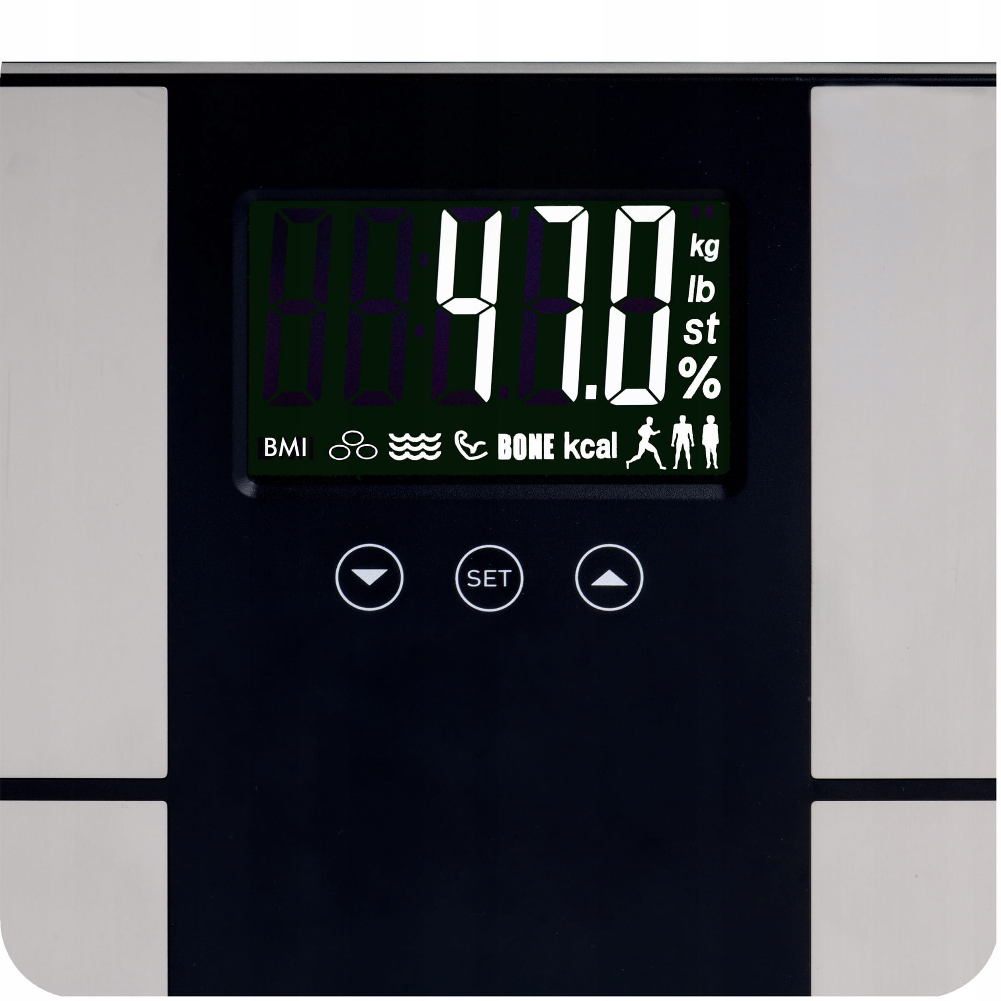 - Mierzy: masę ciała, % tkanki tłuszczowej, % nawodnienia, % tkanki mięśniowej, sugerowane zapotrzebowanie na kalorie i BMI
