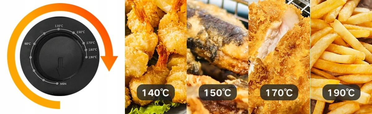 Pokrętło regulacji temperatury pozwala na precyzyjną kontrolę temperatury smażenia, utrzymanie dobrego koloru i smaku potraw, można łatwo przygotować wiele rodzajów pysznych potraw.