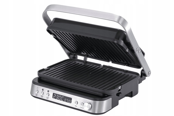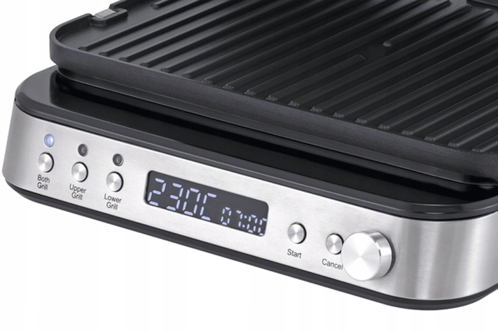 Model ten został wyposażony w moc 2000 W, dzięki której grill nagrzewa się bardzo szybko, zapewniając wysoką sprawność działania. W utrzymaniu i kontrolowaniu wysokiej temperatury, a także idealnego wysmażenia potraw, pomaga dostosowująca się pokrywa górna, która idealnie przylega do grillowanych potraw. Ten element także zapobiega pryskaniu tłuszczu np. na blat kuchenny. Dwustronne (gładkie i karbowane), wyjmowane płyty grzejne o wymiarach 22 x 32 cm pokryte są powłoką nieprzywierającą bez PFOA, co gwarantuje, że przygotowywane dania będą bezpieczne dla zdrowia, a także nie przypalą się, ani nie przykleją w trakcie grillowania.