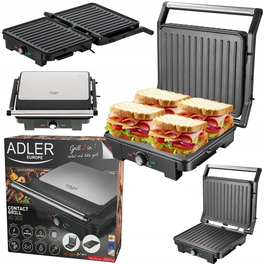 ADLER AD 3051 - Grill elektryczny Adler AD 3051 o mocy maksymalnej 2800W daje możliwość przygotowania szerokiej gamy ciepłych posiłków – od opiekanych burgerów, przez steki, karkówkę, kurczaka i inne mięsa, po grillowane warzywa i sery. Płyty grzejne są zabezpieczone teflonową powłoką, dzięki której potrawy nie przywierają, a późniejsze mycie zajmuje dosłownie chwilę. Dodatkowo powłoka pozwala grillować bez dodatku tłuszczu, co sprawia, że potrawy są zdrowsze. Grill posiada dużą powierzchnię grillowania – wystarczającą do jednoczesnego przygotowania posiłku dla rodziny lub grupy znajomych.