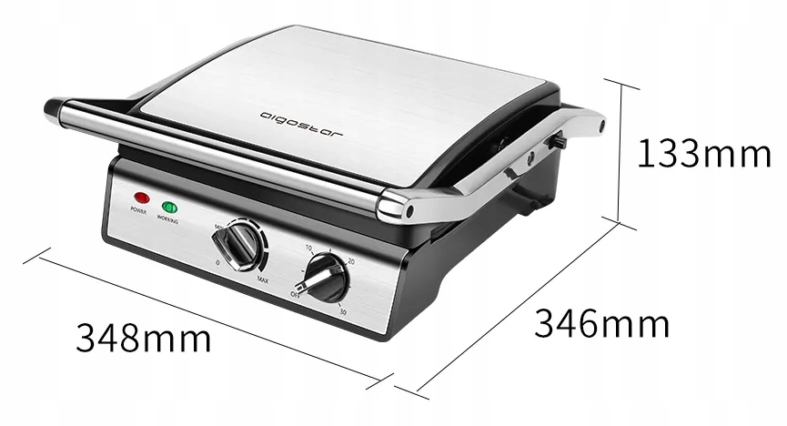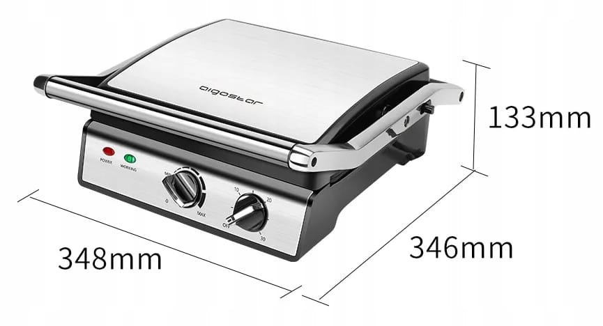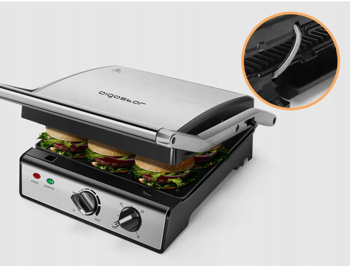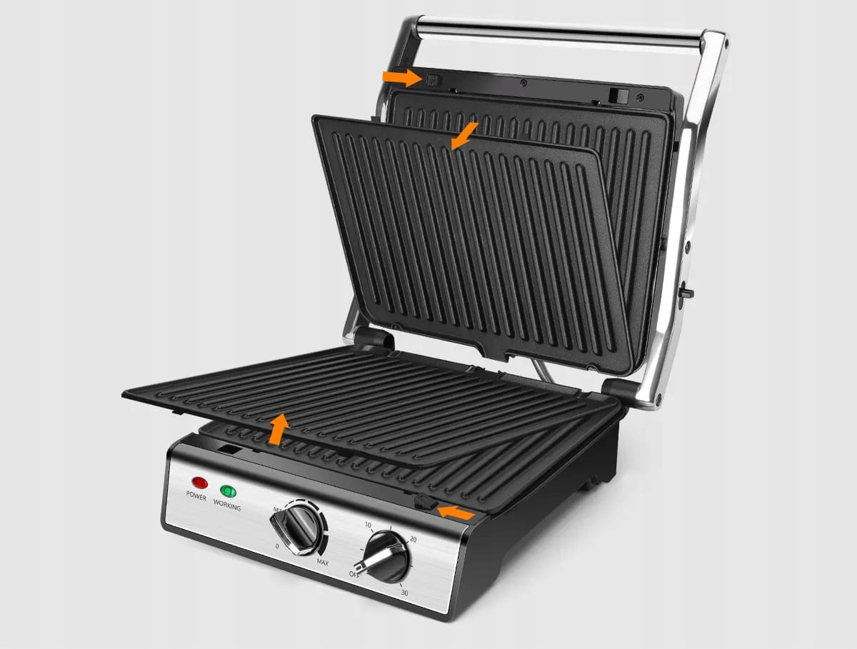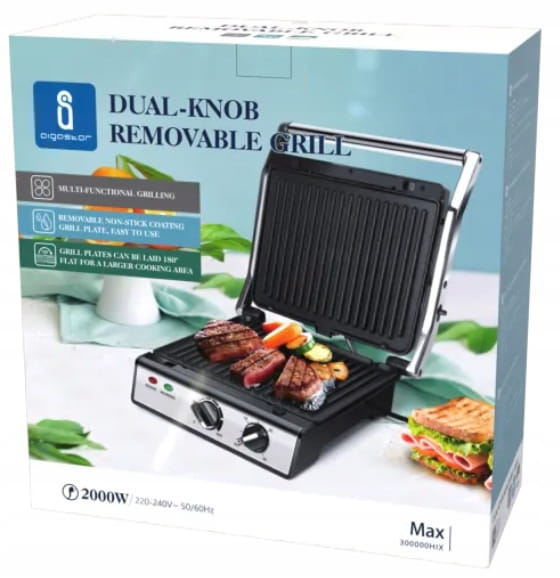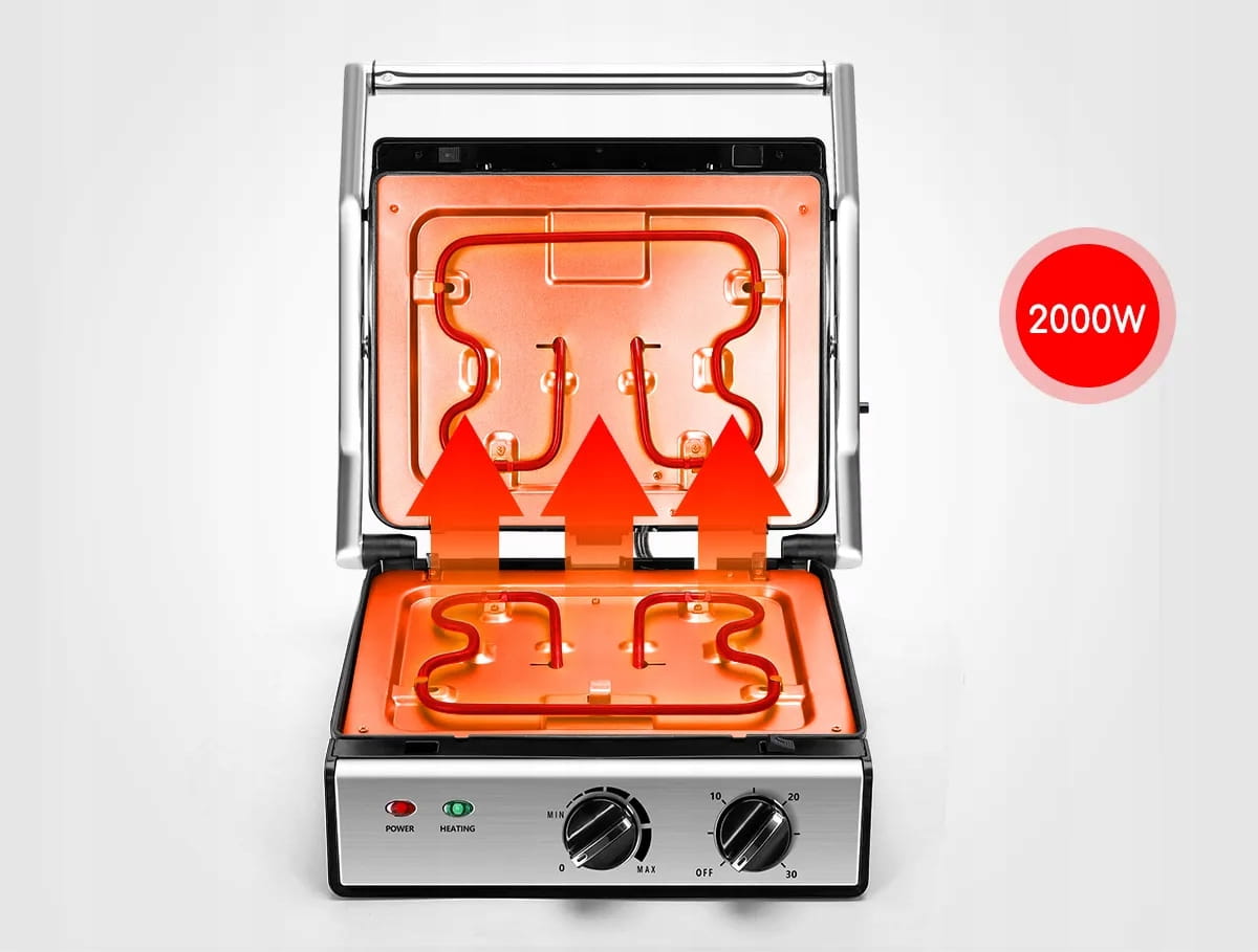 Górna i dolna płyta grillowa posiadają elementy grzejne, wysoka moc 2000W sprawia, że jedzenie zostaje szybko przyrządzone, unikając ryzyka niedosmażenia i skracając czas czekania