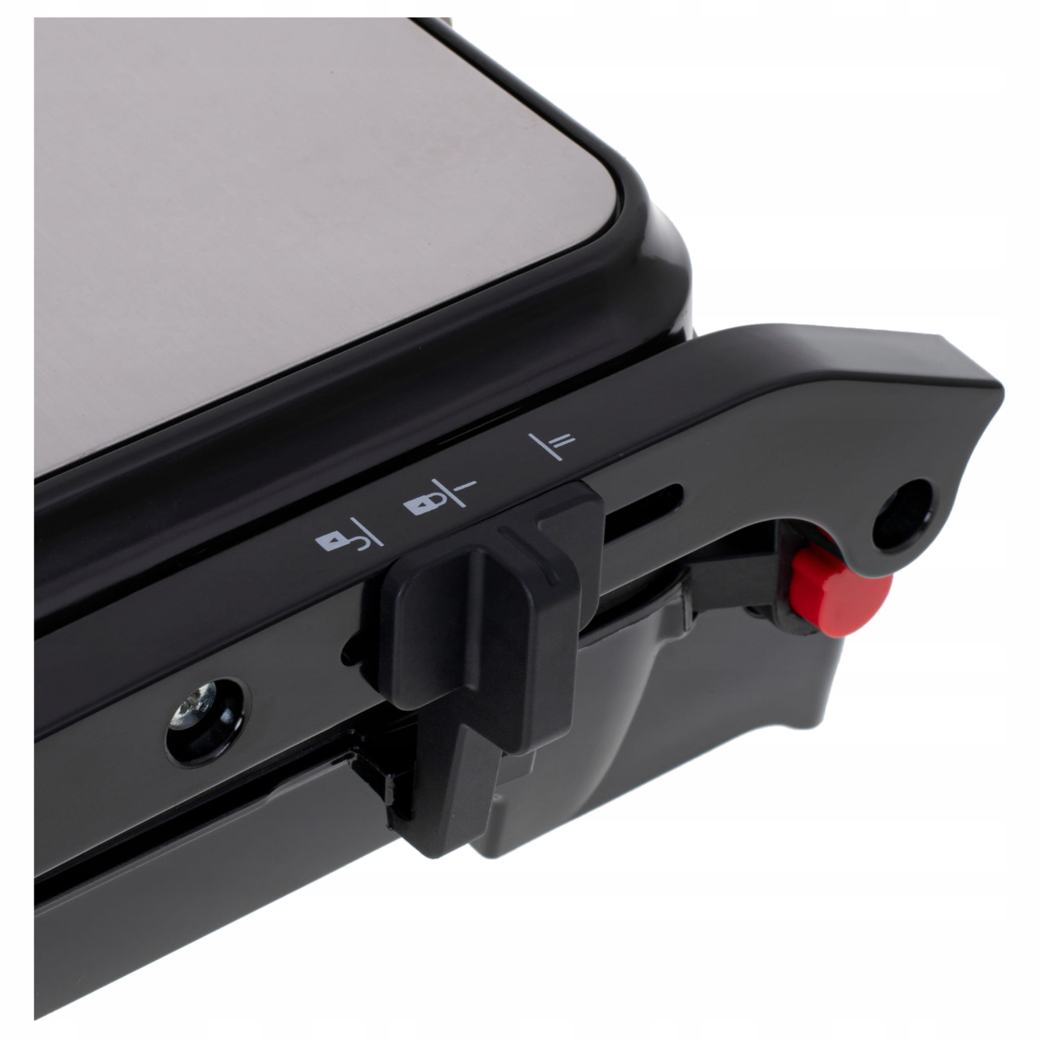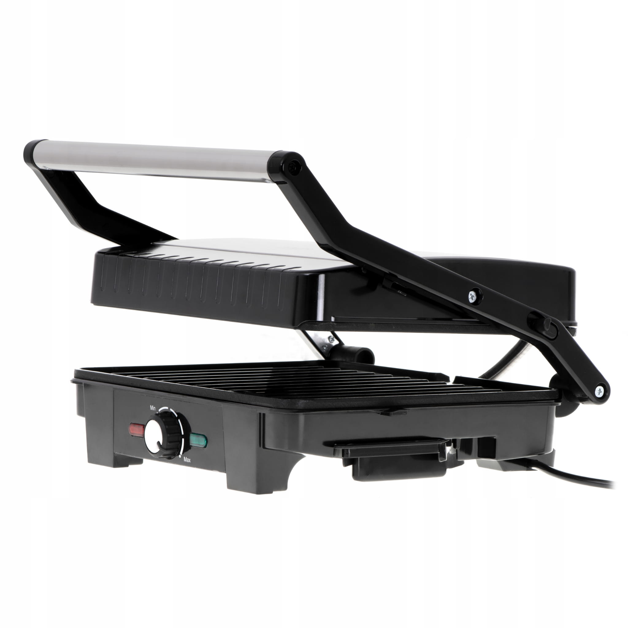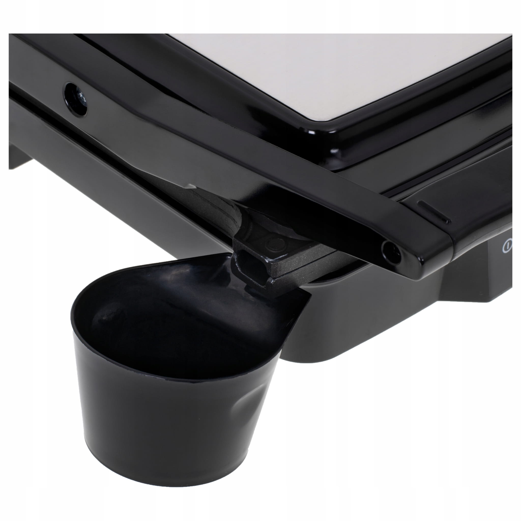 Regulowany kąt nachylenia płyty | 2 pojemniki na ściekający tłuszcz oraz szpatułka w zestawie | Powłoka nieprzywierająca na płytach | Moc 2500W | Grill rozkładany na płasko | Regulowany termostat