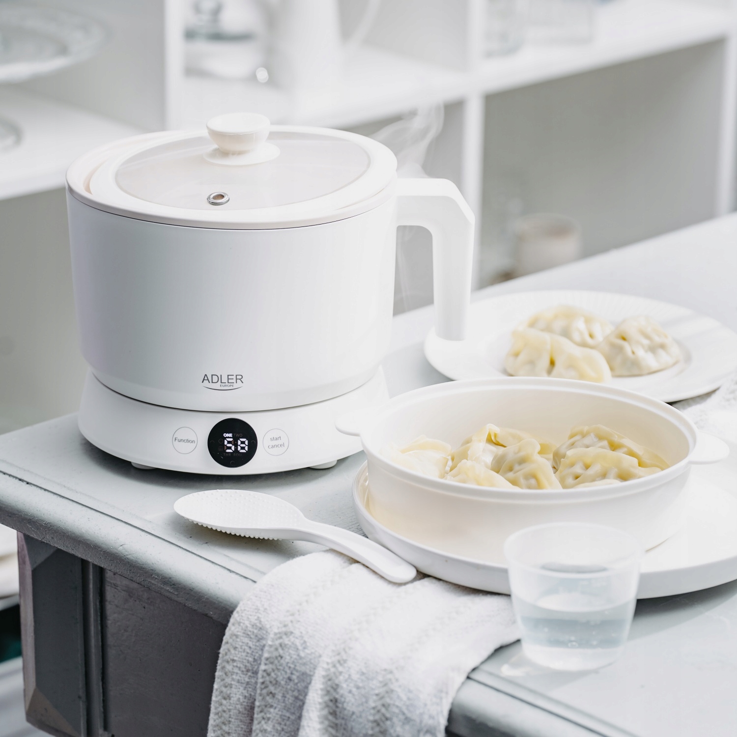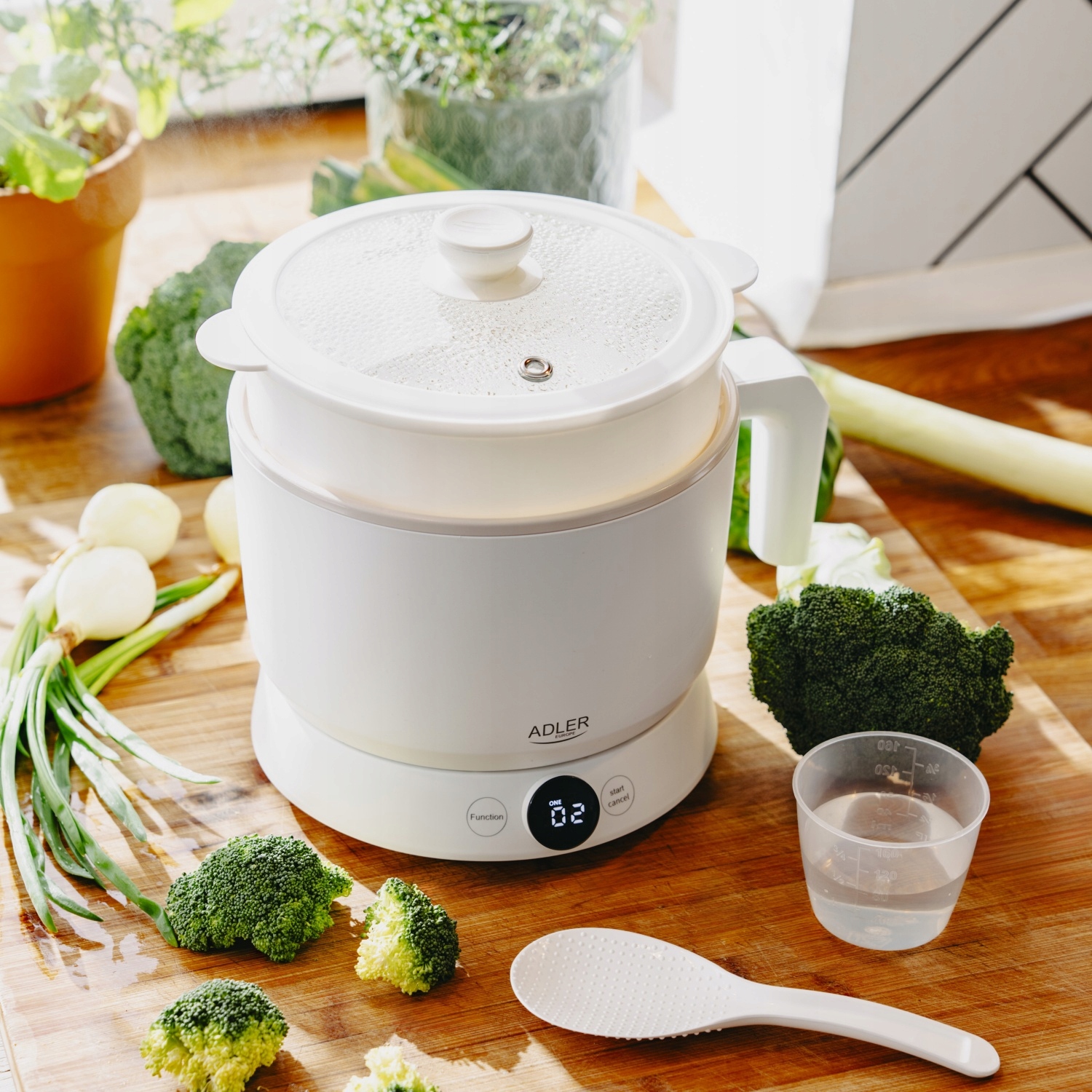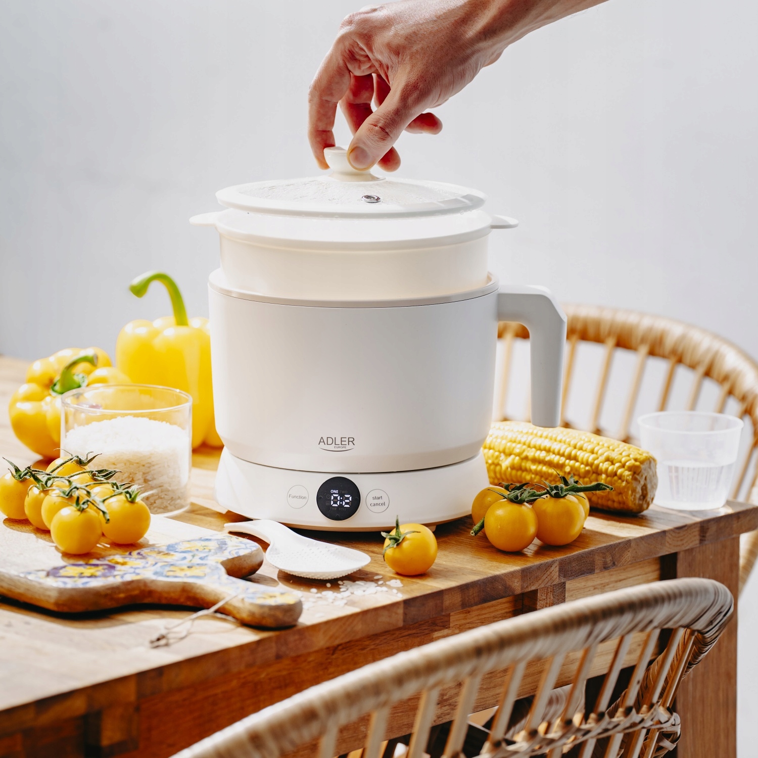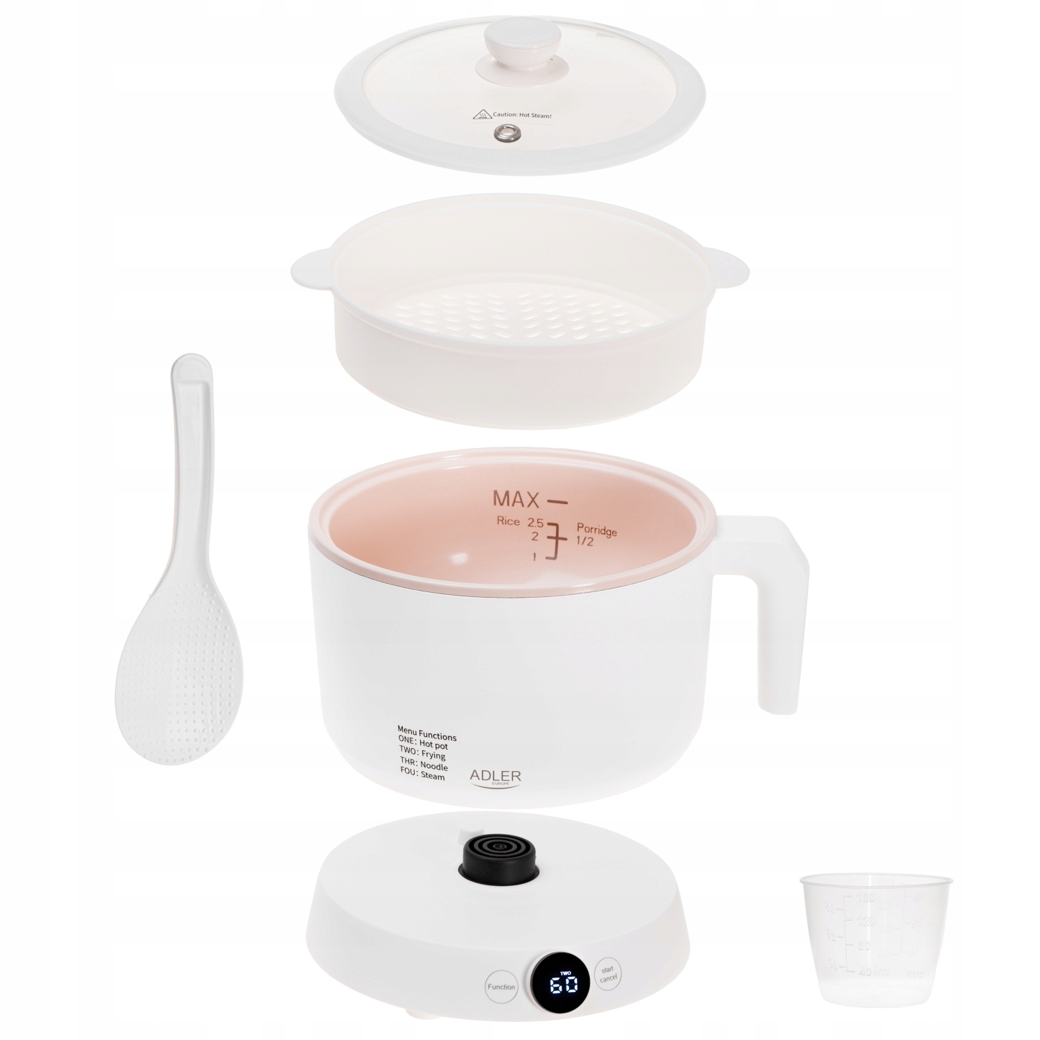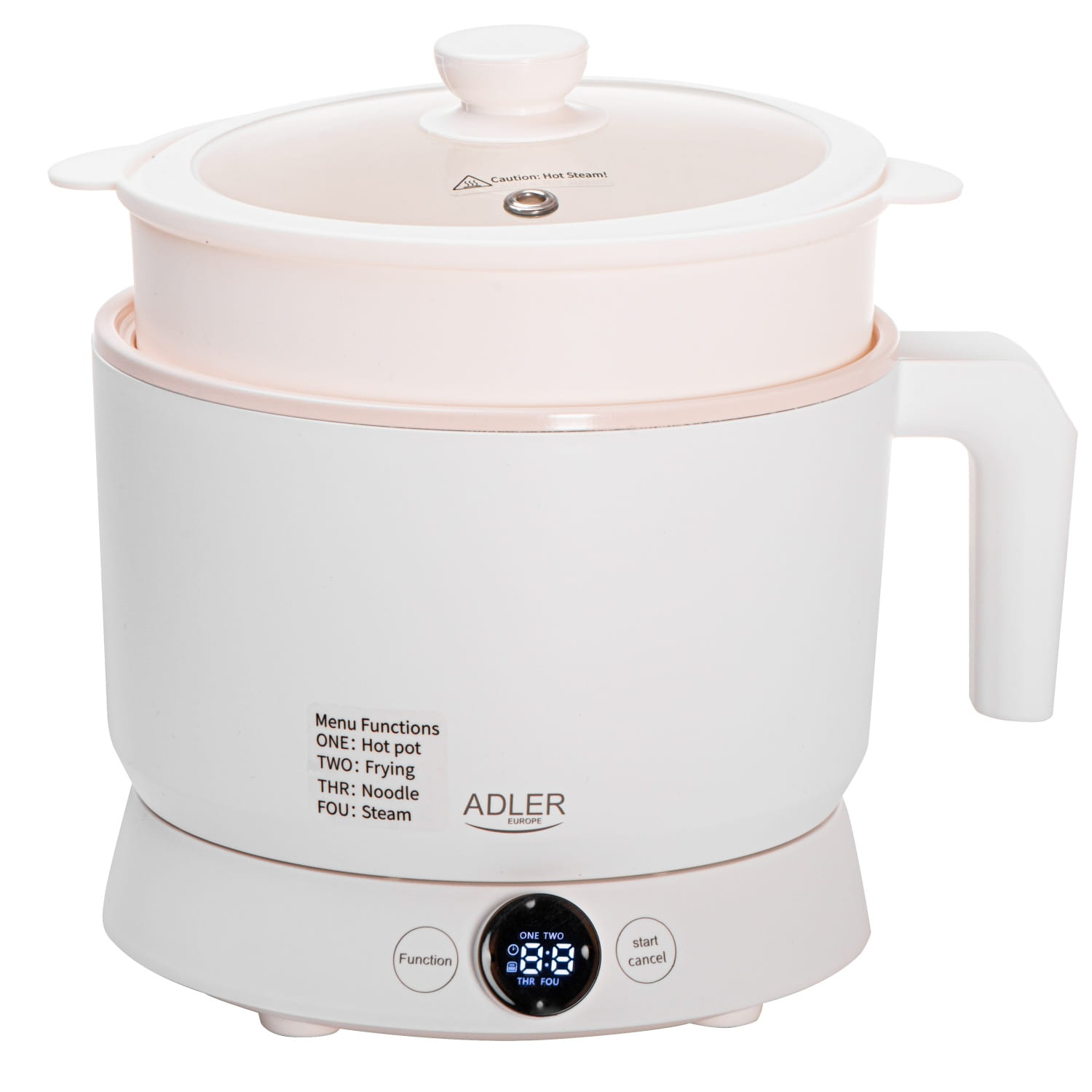 Adler AD 6422 Elektryczny Garnek Wielofunkcyjny to kompaktowe i nowoczesne urządzenie, które zastąpi kilka sprzętów kuchennych jednocześnie. Dzięki 4 inteligentnym trybom pracy umożliwia duszenie, smażenie, gotowanie makaronu oraz gotowanie na parze - szybko, wygodnie i bez zbędnych naczyń.