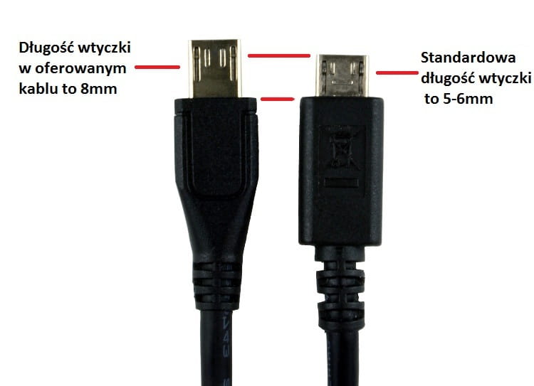 - Charakteryzuje się przedłużonym gniazdem micro USB, dzięki temu można go podpiąć do telefonów myphone Hammer AXE LTE itp