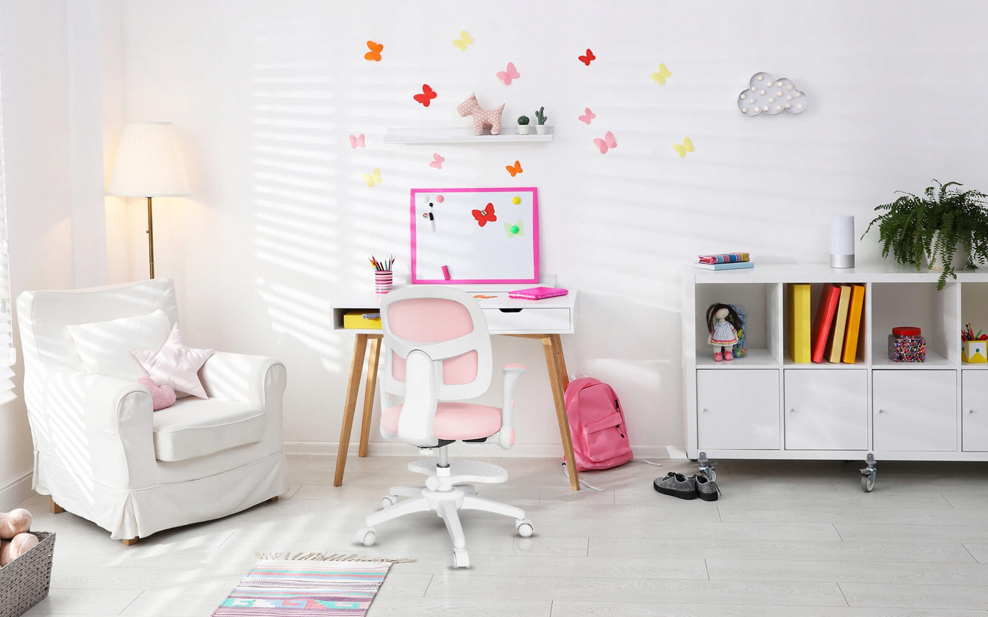 Podnóżek ułatwia przyjęcie ergonomicznej pozycji podczas siedzenia i zapobiega męczeniu się nóg. Regulacja góra – dół umożliwia dopasowanie krzesła obrotowego do wzrostu, gwarantując dziecku stabilne podparcie.