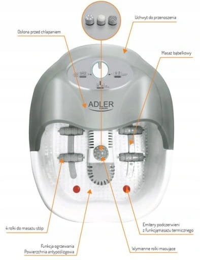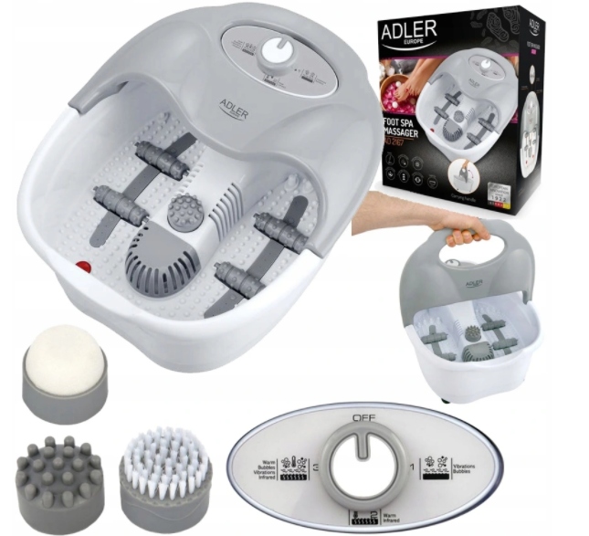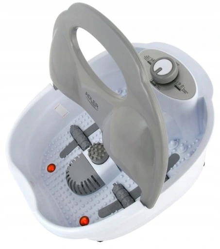 ADLER AD 2167 - wielofunkcyjny masażer do stóp z uchwytem do przenoszenia. Wykorzystywany w celach relaksacyjnych oraz zdrowotnych. Pozwala na różne rodzaje masażu: bąbelkowy, wibracyjny, suchy. Podtrzymywanie temperatury wody pozwala na komfortowy masaż przez czas, w którym standardowo woda zdążyłaby już wystygnąć. Masażer pozytywnie wpływa na ukrwienie stóp, dodatkowo poprzez zakończenia nerwów znajdujące się na podeszwach stóp, ma korzystny wpływ na cały organizm. Daje też szansę na odprężenie po dniu pełnym napięć lub po okresie chodzenia w niewygodnym obuwiu.