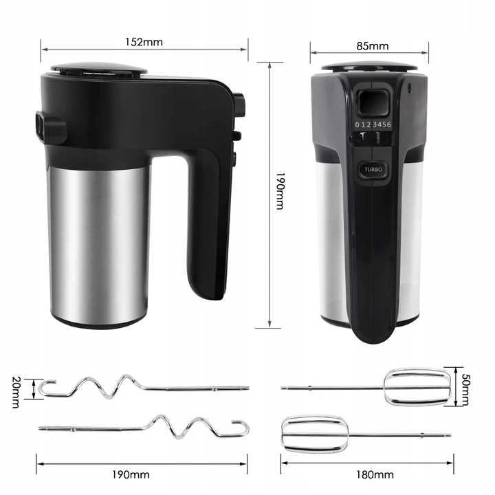 - Cechy dodatkowe: Materiał do kontaktu z żywnością, bez BPA, Obrotowa część kablowa, Rozmontowanie mieszadeł jednym kliknięciem, Wyposażony w cztery mieszadła