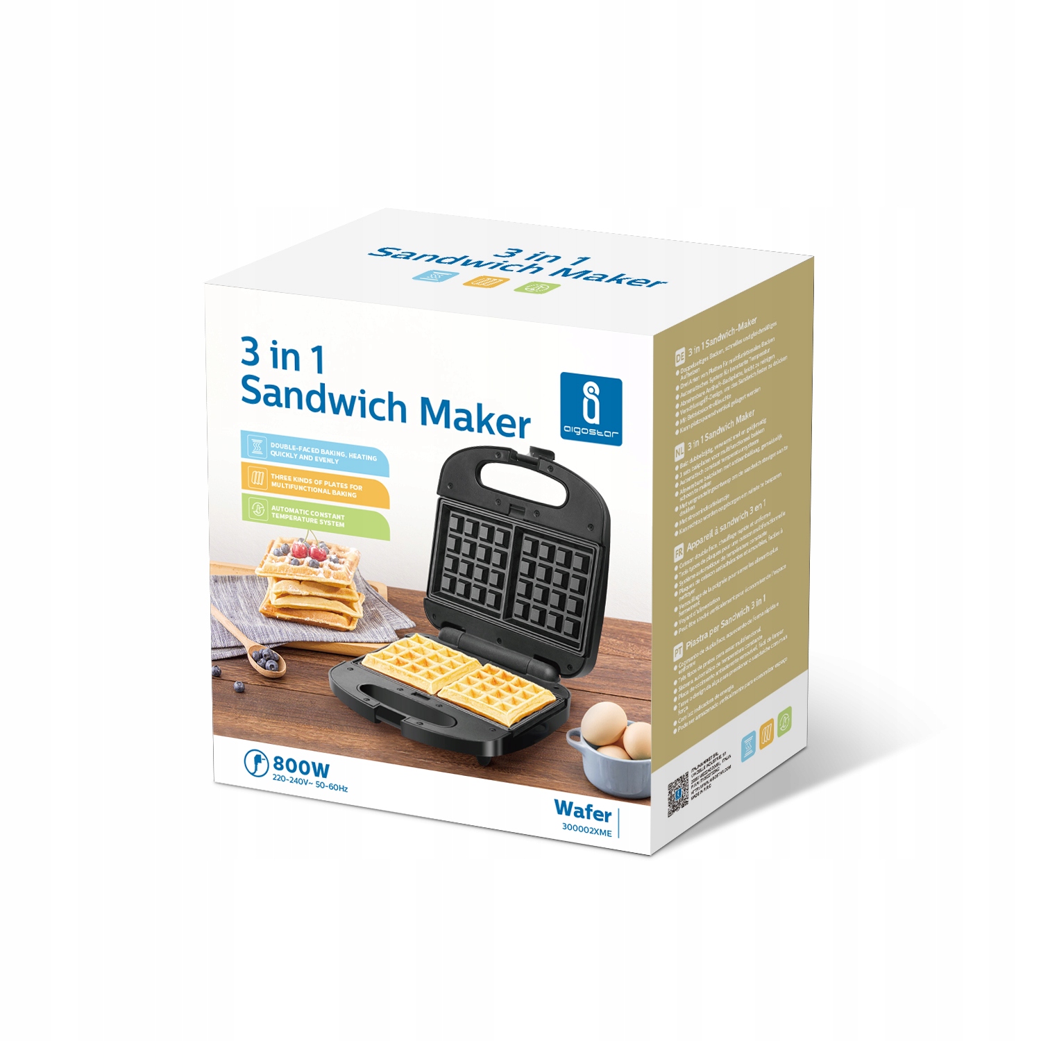 - Wyposażenie: 3 komplety wymiennych płyt: kanapki; grill; gofry