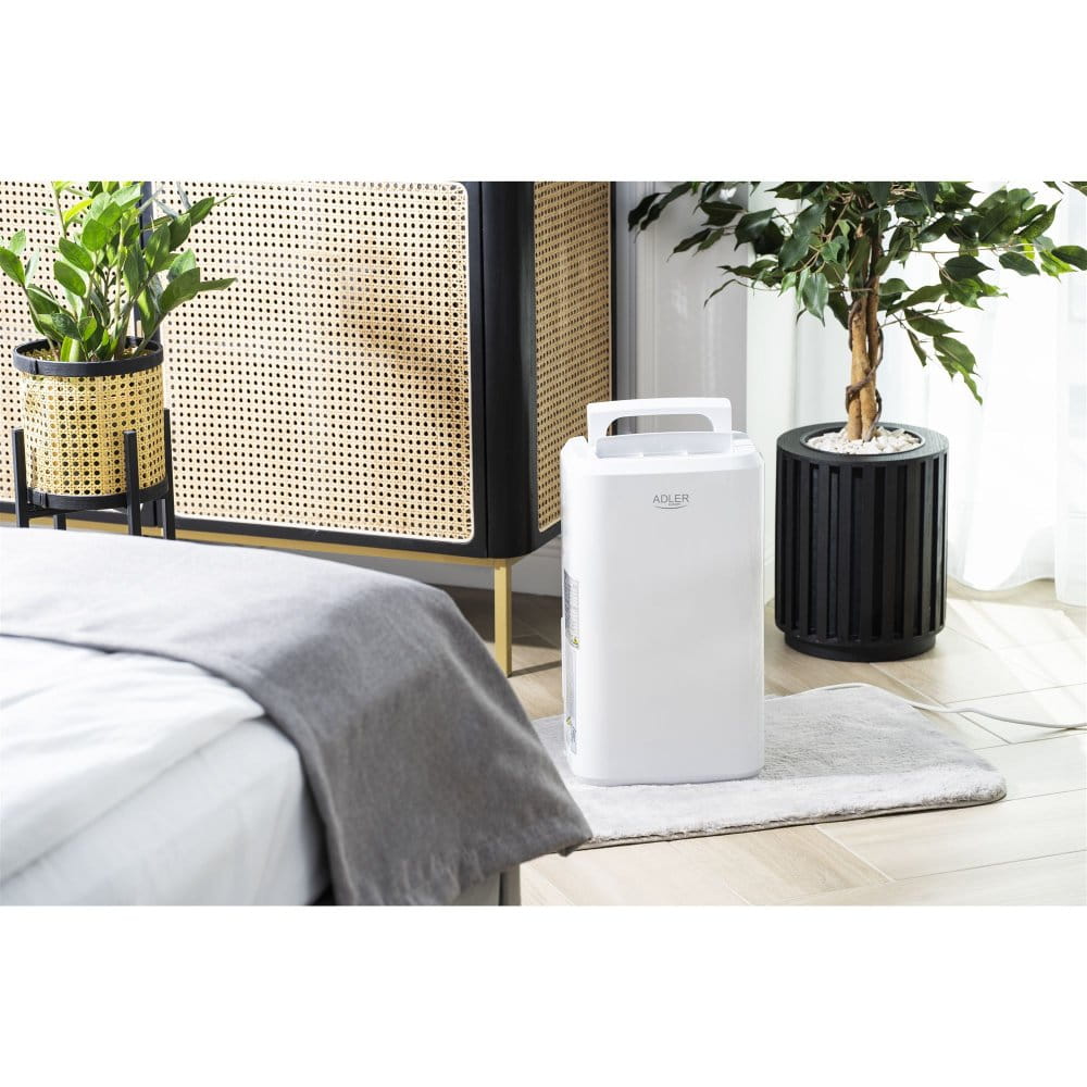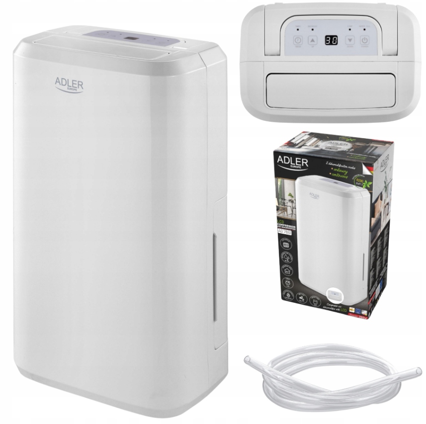 Adler 7861 to kompresorowy osuszacz powietrza o wydajności 10 litrów wody na dobę z wyświetlaczem LCD. Urządzenie ma 2 tryby osuszania: praca przerywana w celu utrzymania zadanego poziomu wilgotności w pomieszczeniu i ciągły. Osuszacz Wyposażony jest precyzyjny czujnik wskazujący aktualny poziom wilgotności w pomieszczeniu. Urządzenie po osuszeniu pomieszczenia do oczekiwanego poziomu wilgotności automatycznie wyłącza kompresor zapewniając cyrkulację powietrza poprzez działający wentylator. Zbiornik na wodę ma pojemność 2,0 litrów, a zapełnienie pojemnika na wodę sygnalizowane jest sygnałem świetlnym i dźwiękowym. Osuszacz powietrza posiada timer od 1 do 24 godzin z funkcją opóźnionego startu. Przepływ powietrza to 150m3/godz.