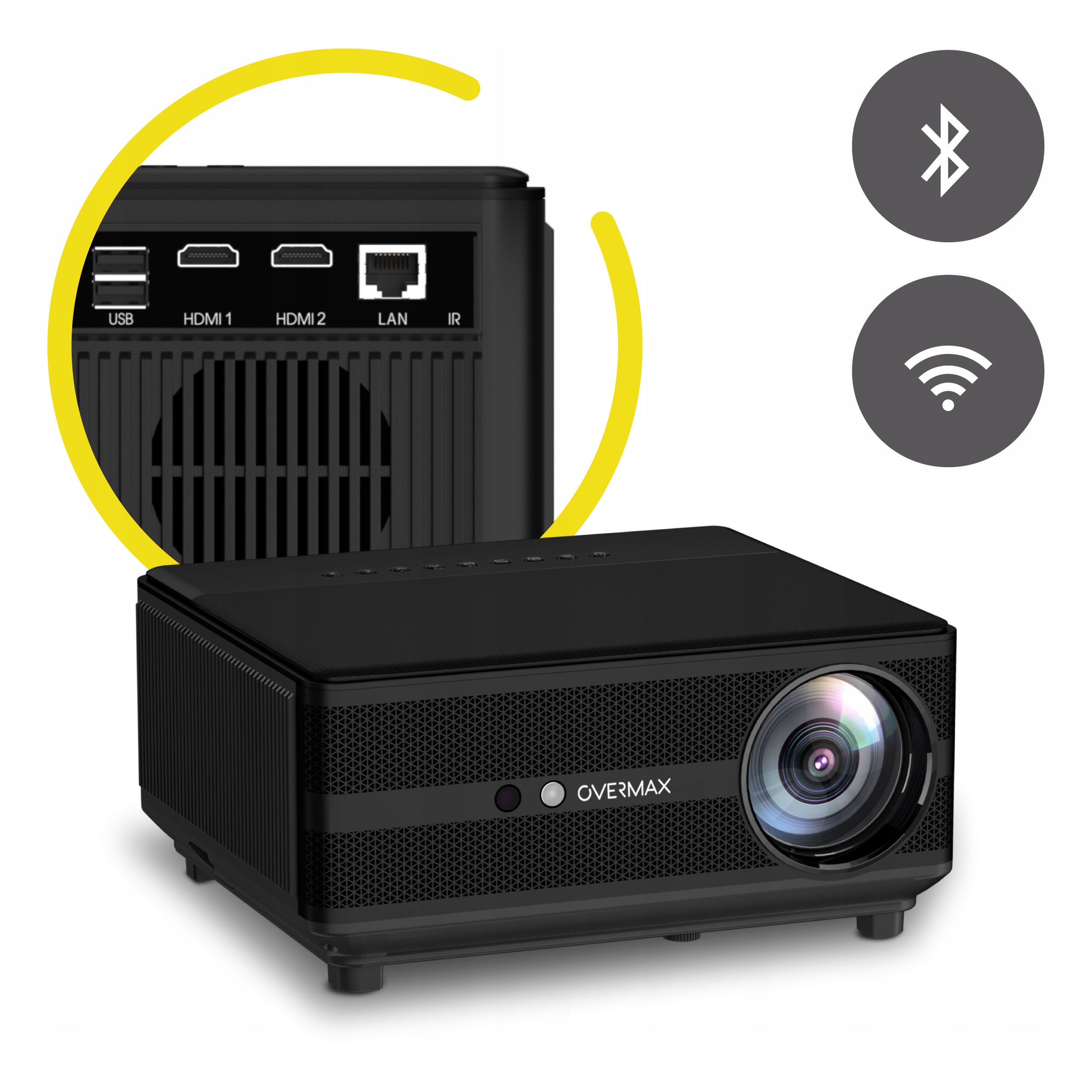 Overmax Multipic 6.1 to projektor z wieloma wejściami, w tym 2x HDMI, 2x USB, AV, RJ45 i IR, umożliwiający podłączenie wielu urządzeń naraz - konsole, odtwarzacze, komputery - bez problemu.