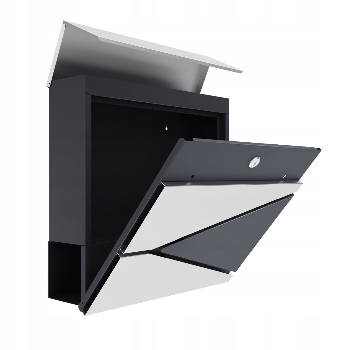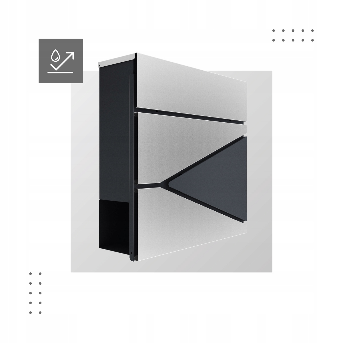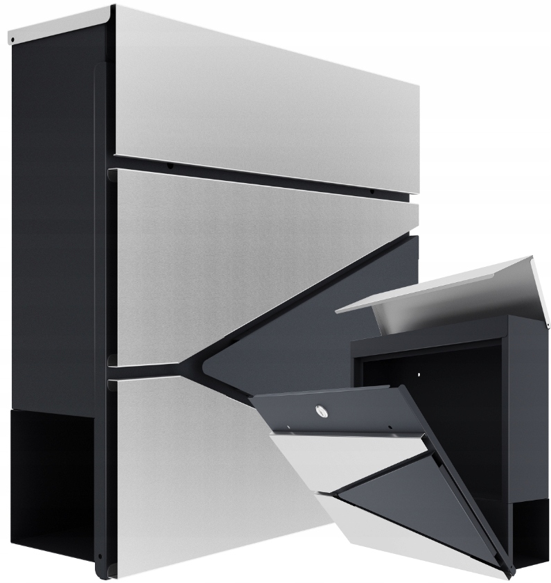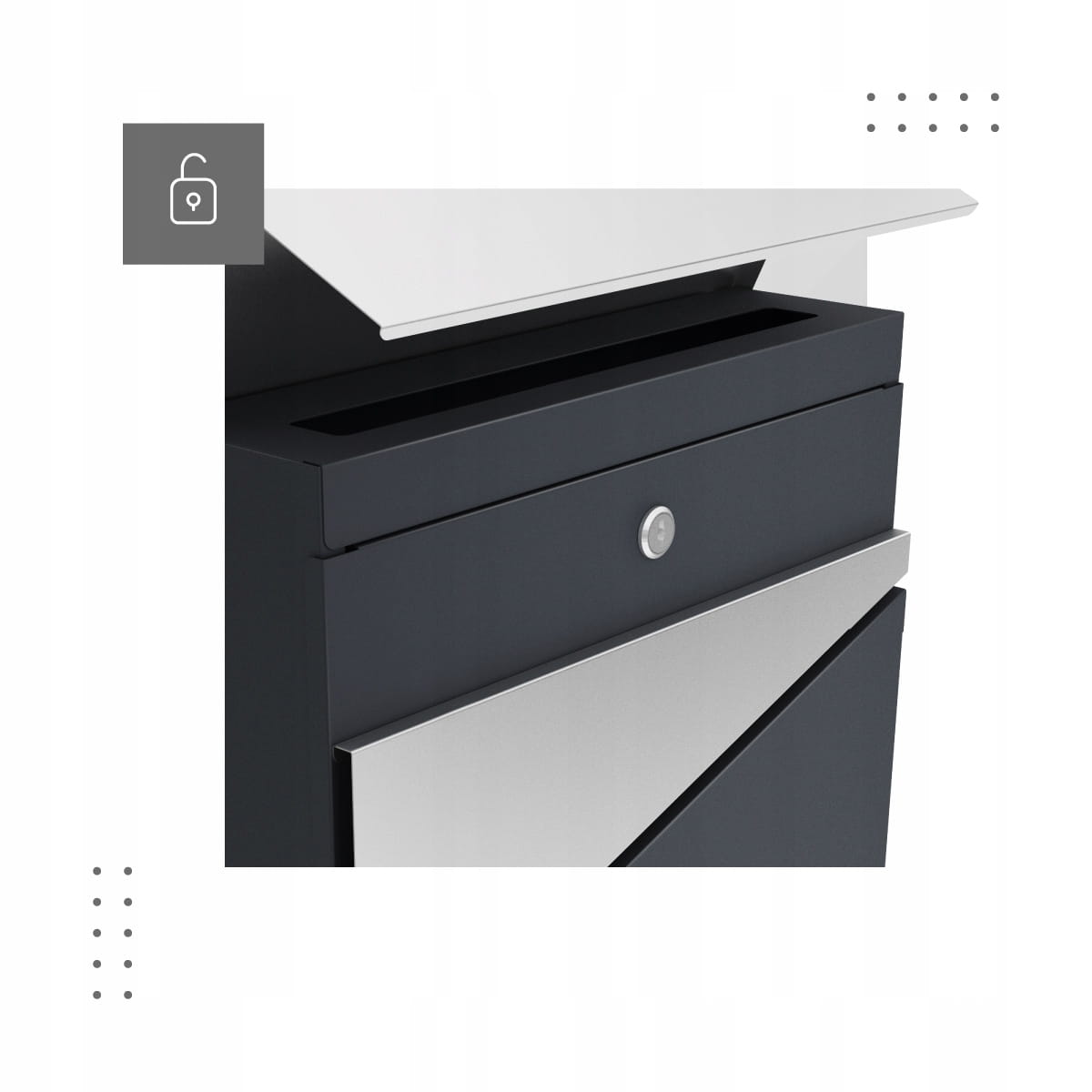 Nowoczesna konstrukcja skrzynki skrywa ciekawe rozwiązania - zamek ukryty jest pod górną pokrywą, dzięki czemu nie rzuca się w oczy. Jednocześnie jest łatwo dostępny dla właścicieli skrzynki. Pod pokrywą ukryty jest również wlot na korespondencję, co zabezpiecza listy przed czynnikami zewnętrznymi. Otwierana przednia część Przednia część skrzynki otwiera się w całości, dzięki czemu dostęp do korespondencji jest bardzo wygodny. Bez trudu wyjmiesz ze skrzynki koperty w rozmiarze A4.