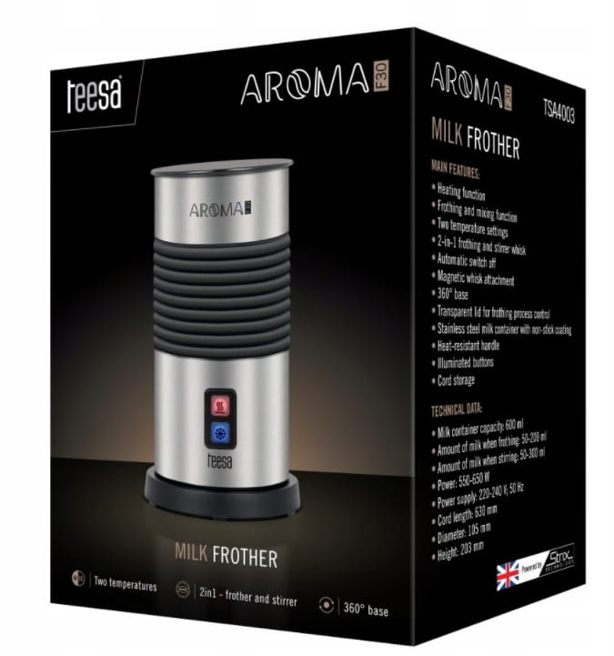Nic tak nie poprawia humoru z rana, jak pyszna kawa z delikatną pianką. Zwłaszcza jeśli jej przygotowanie zajmuje tylko kilka chwil. Spieniacz do mleka Teesa AROMA F30, w mgnieniu oka pozwoli Ci wyczarować doskonałą piankę mleczną, która nada Twojej kawie magii. Co więcej, dzięki opcji ustawienia zimnej lub ciepłej temperatury, w zależności od nastroju możesz oddać się przyjemności tworzenia cappuccino lub zimnego frappe, a także pysznego kakao lub czekolady dla najbliższych.