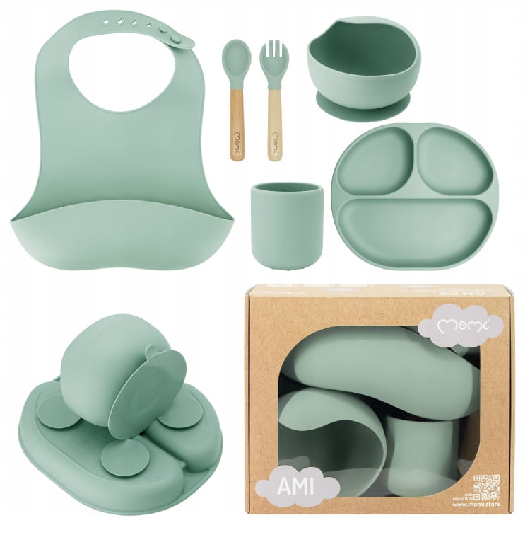 - ZESTAW NACZYŃ DO KARMIENIA DLA DZIECI - MoMi AMI ZIELONY - SILIKONOWY