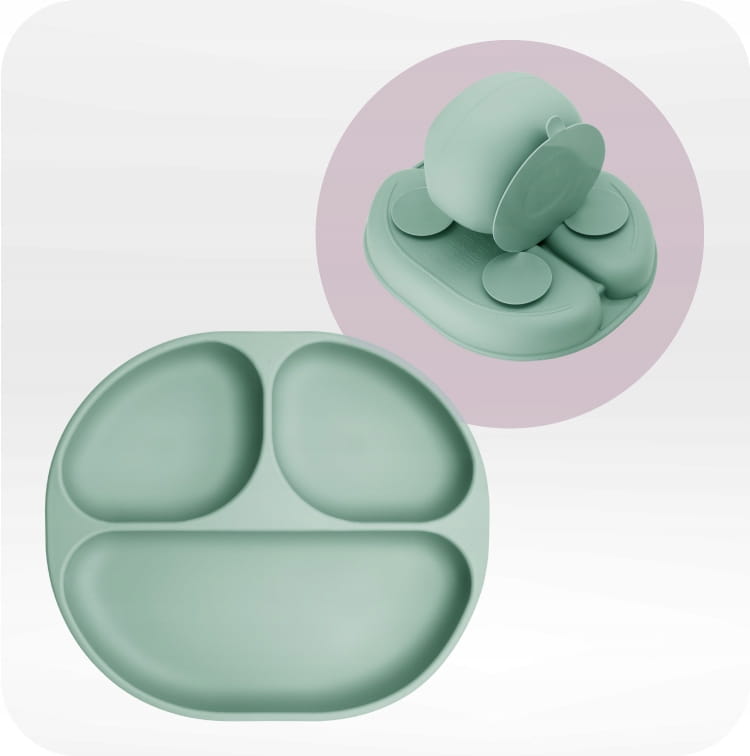 Wysokie boki naczyń MoMi AMI ułatwiają samodzielne nakładanie posiłku na sztućce, a trójdzielny talerzyk umożliwia podział posiłku na porcje. Antypoślizgowe przyssawki pod miseczką i talerzykiem sprawiają natomiast, że naczynia stabilnie stoją na tacy krzesełka do karmienia czy stole.