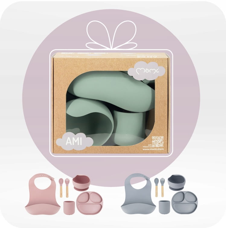 MoMi AMI to naczynia doskonale nadające się do nauki samodzielnego jedzenia. W skład zestawu wchodzi miseczka oraz talerzyk z przyssawką, kubek, sztućce z drewnianą rączką oraz wygodny i miękki śliniak z kieszonką. Naczynia MoMi AMI wykonane są z silikonu przeznaczonego do kontaktu z żywnością. Nie zawiera BPA i ftalanów. Zapakowane są w kolorowym pudełku – dzięki czemu idealnie nadają się na prezent dla Malucha!