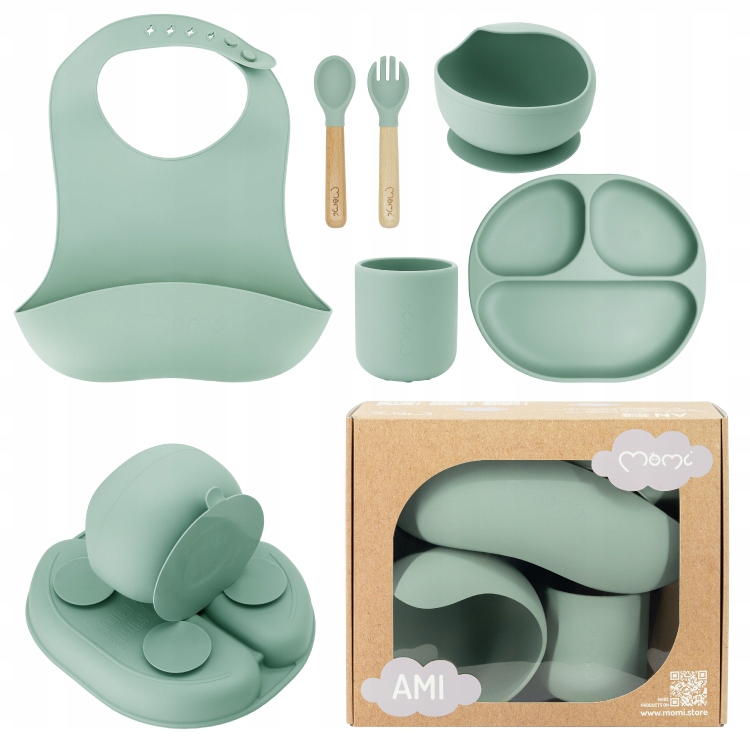 W skład zestawu MoMi AMI wchodzi: miseczka oraz trójdzielny talerzyk z przyssawką, kubek, łyżeczka i widelec z drewnianymi rączkami oraz śliniak z kieszonką. Silikonowe naczynia można myć w zmywarce oraz używać do podgrzewania pokarmu w kuchence mikrofalowej.