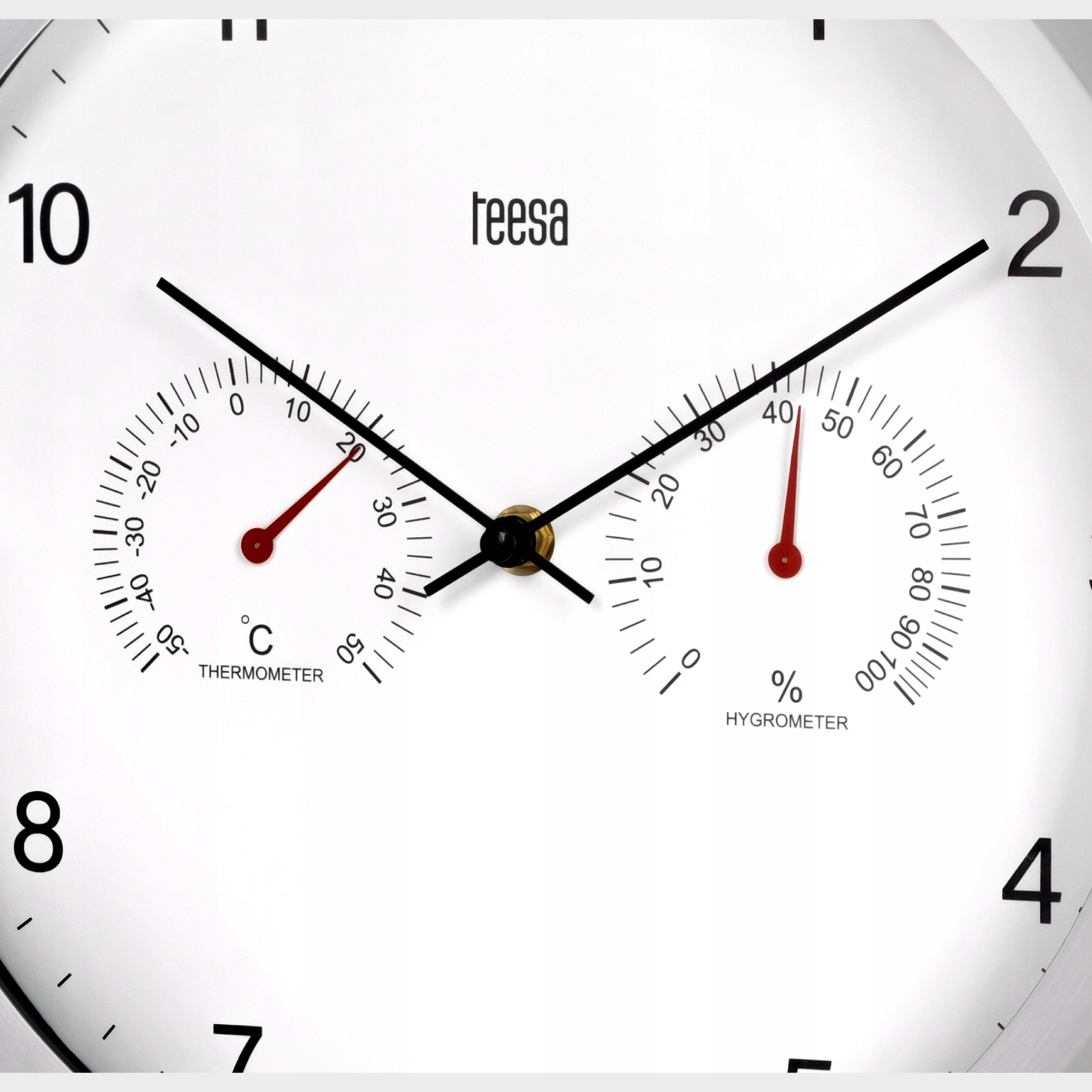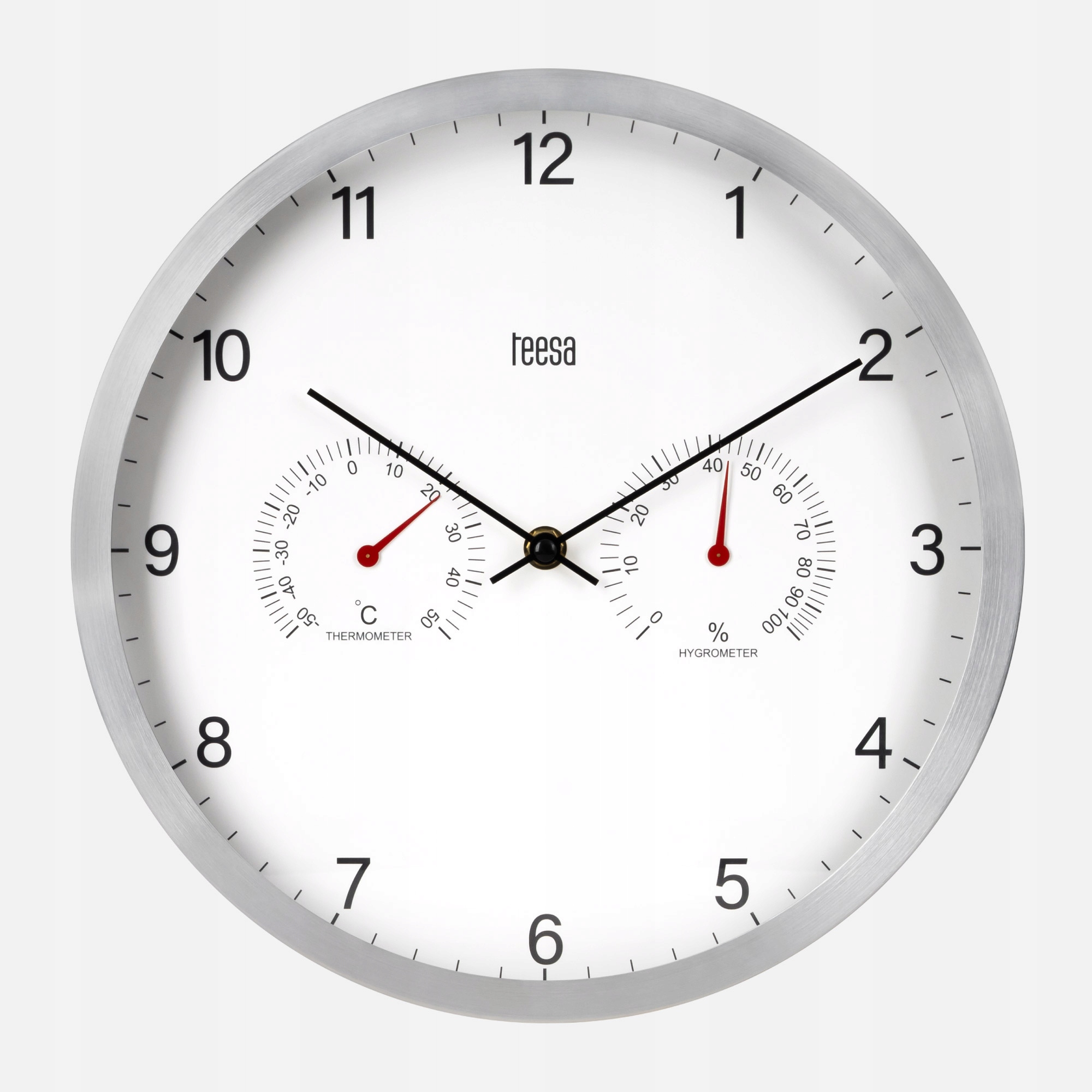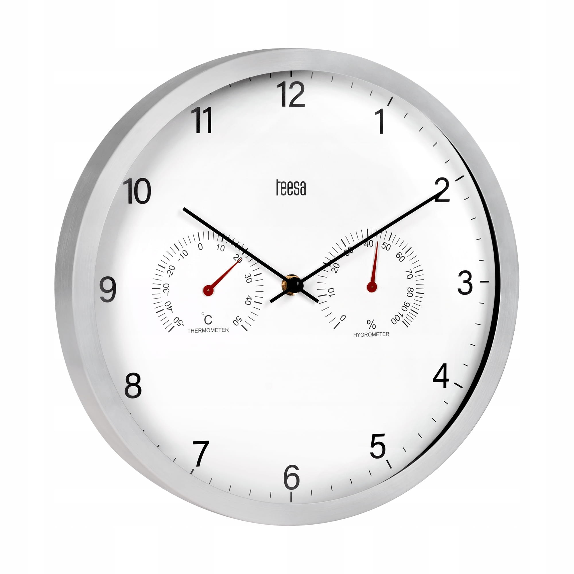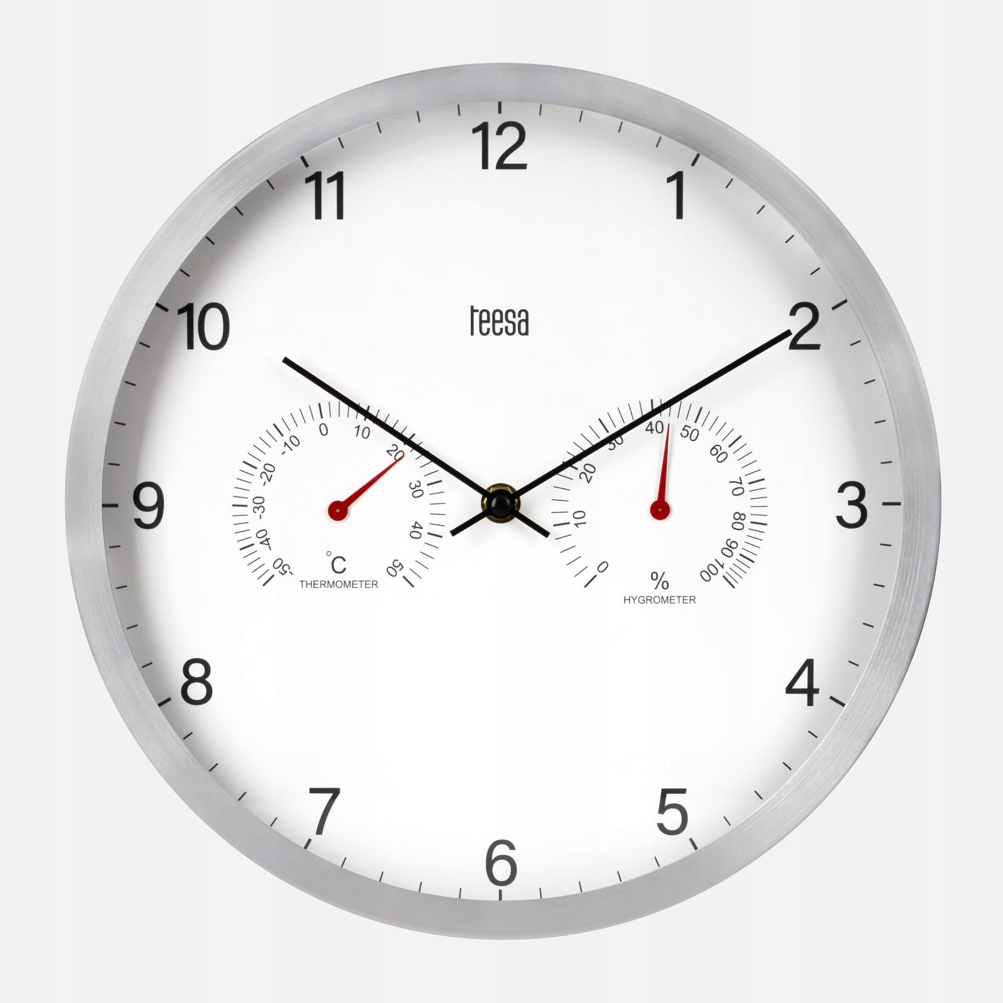 Oprócz precyzyjnego wskazywania czasu, zegar Teesa został wyposażony w praktyczny termometr oraz hydrometr. Dzięki nim w każdej chwili można sprawdzić temperaturę oraz poziom wilgotności powietrza, co jest szczególnie przydatne w domach, biurach czy warsztatach. To doskonałe narzędzie do dbania o optymalne warunki otoczenia, sprzyjające zdrowiu i komfortowi użytkowników.